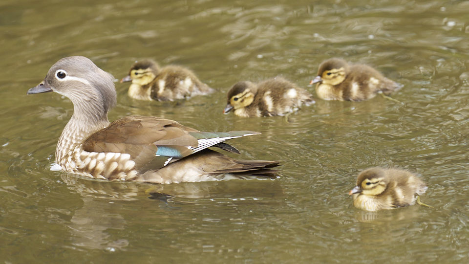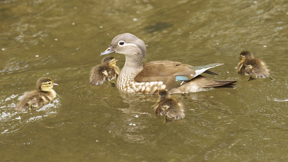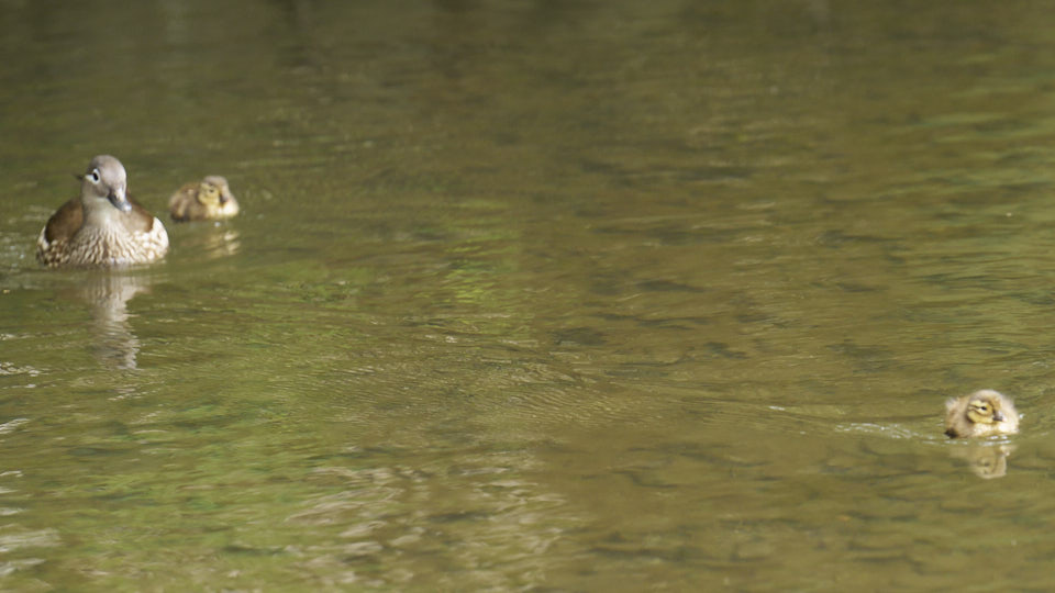 今朝新たなヒナ一家を見掛けました。オシドリ6組目のヒナ5羽です。