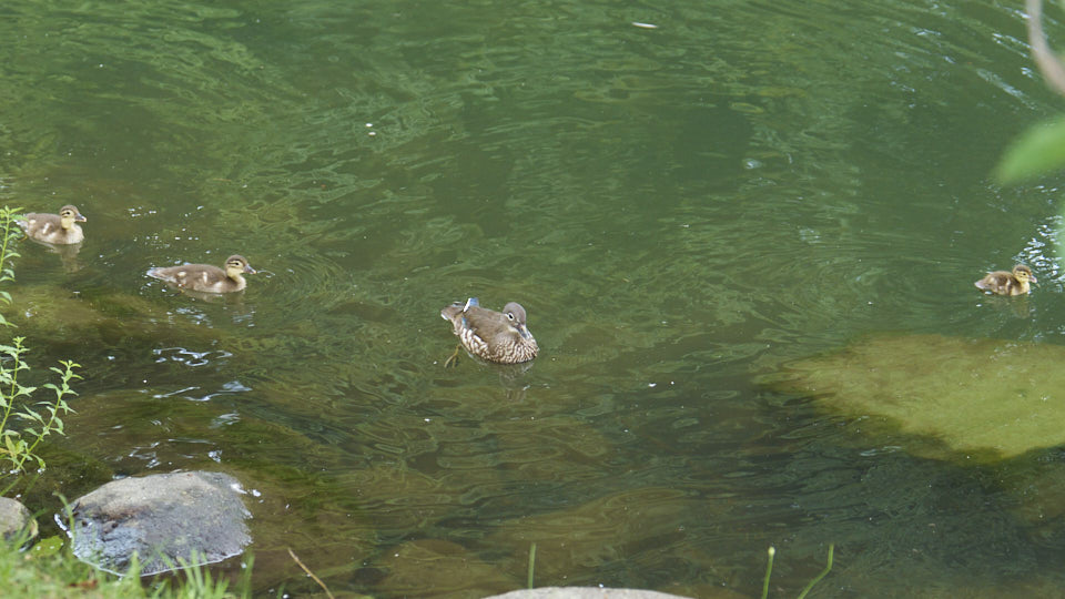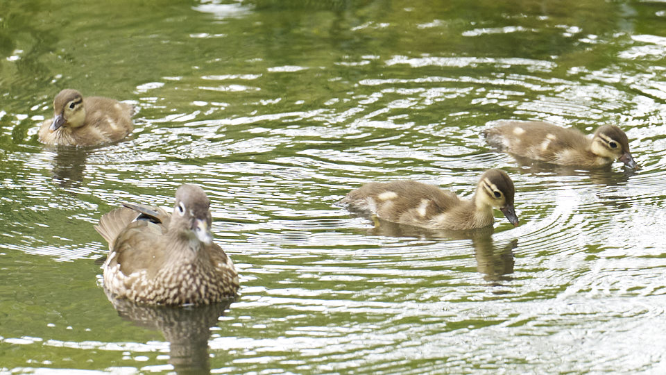 2025年8月4日朝 オシドリ5組目ヒナ3羽と母鳥
