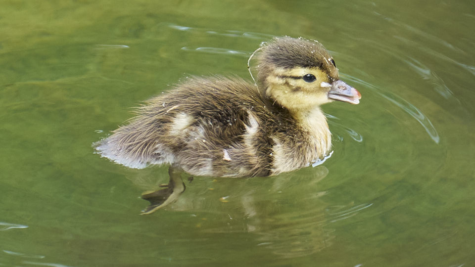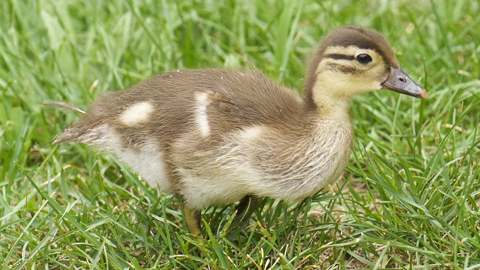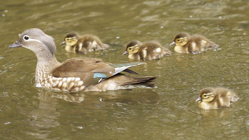 迷子ヒナ1羽を合わせヒナ5羽のオシドリ6組目が出現
