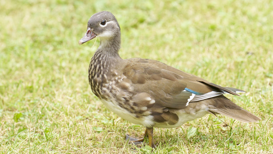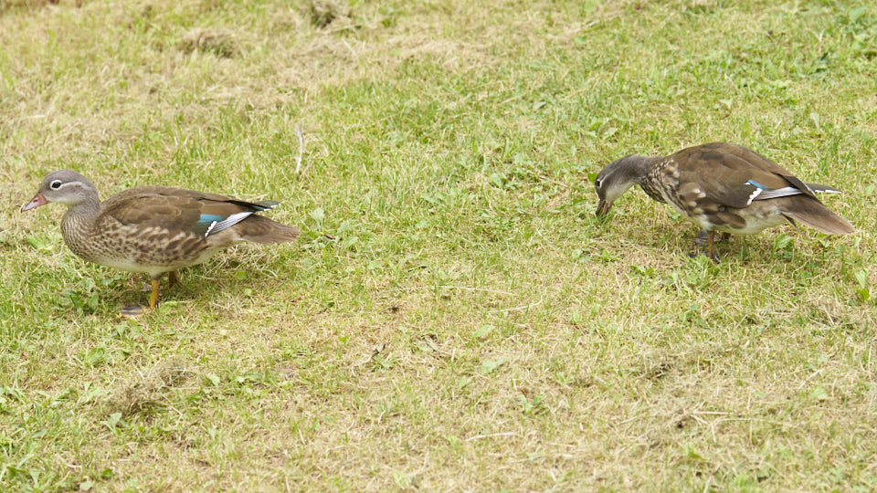 久しぶりにオシドリ2組目の母鳥を見掛けました。若鳥1羽と仲良く草をついばんでいました。