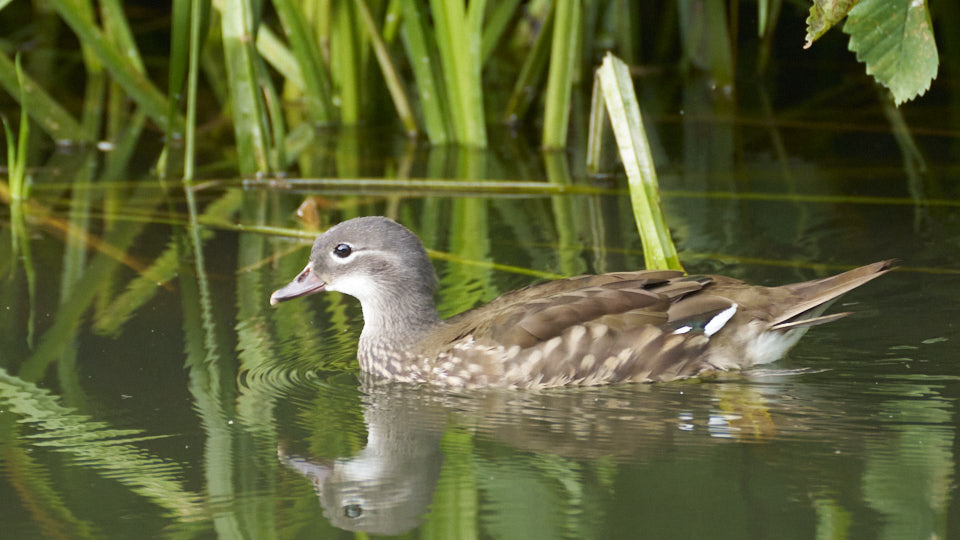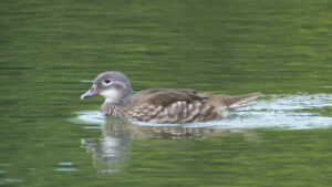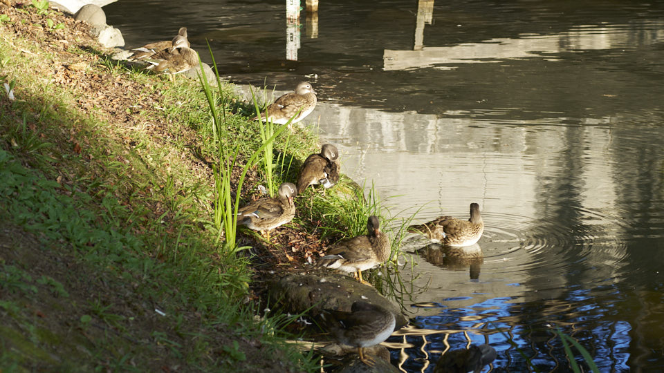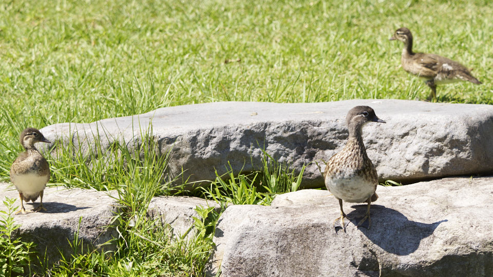 立派に成長したオシドリの若鳥が、池のほとりに集まってくつろいでいます。1組目〜4組目のヒナがごちゃ混ぜになっている様です。