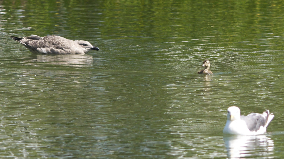 12:42 もう1羽のヒナは菖蒲池北側でカモメの親子の近くにいました。
