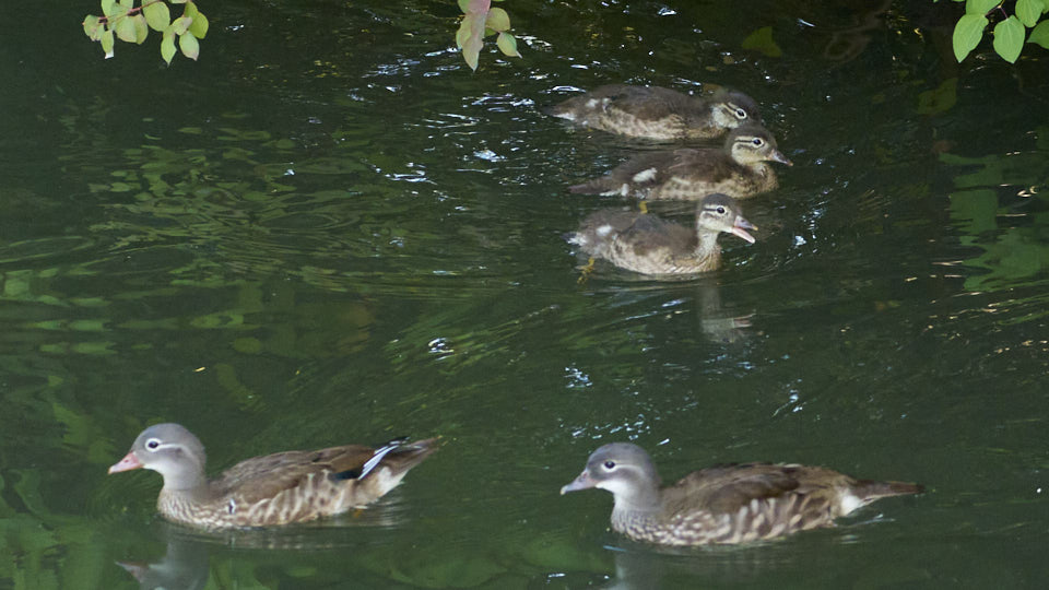 手前の2羽は別の組のヒナが大きくなったオシドリ(子供)だと思います。