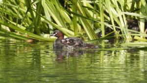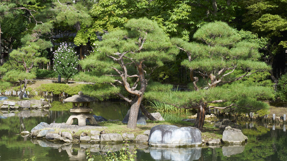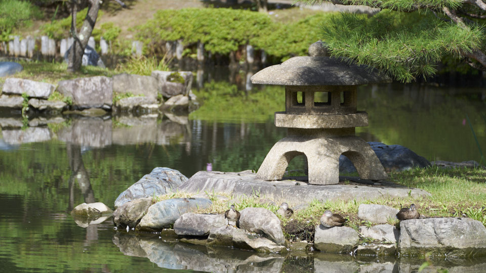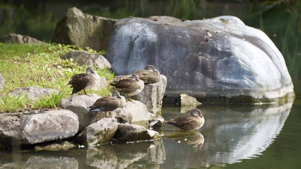 日本庭園の池に浮かぶ島には、いつも10羽程度のオシドリがいます。今年生まれたヒナが成長したと思われる幼鳥も数羽もいます。