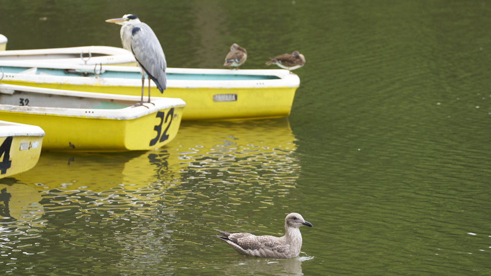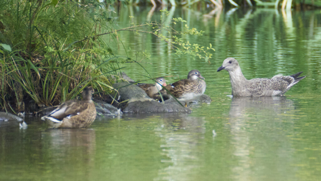 カモメの幼鳥の近くには、アオサギとオシドリ2羽がいました(ともにボートの上)。