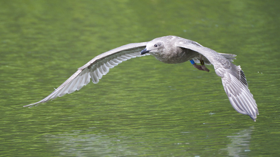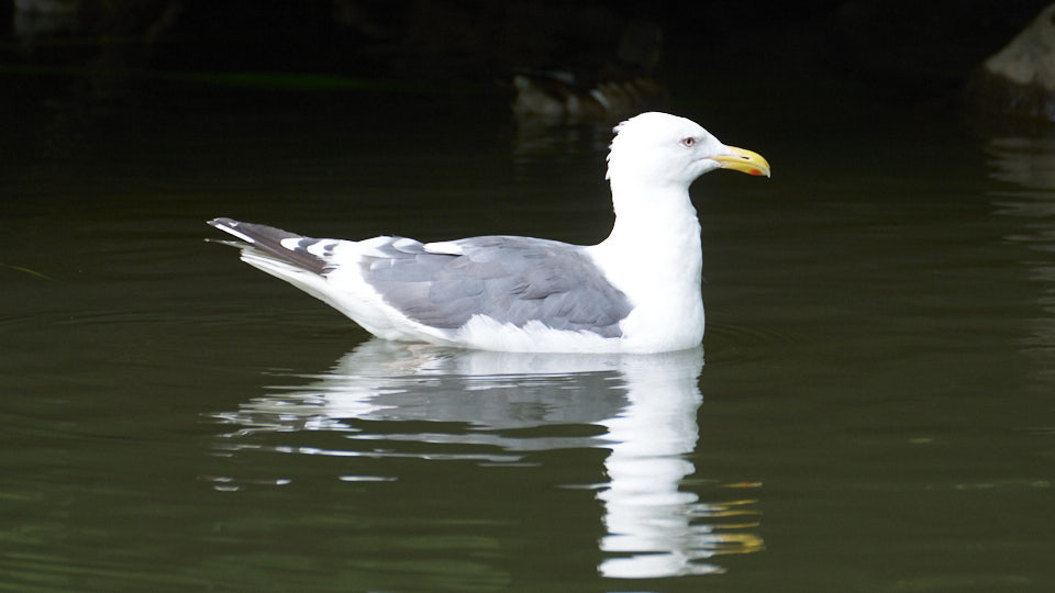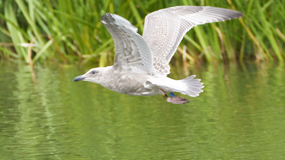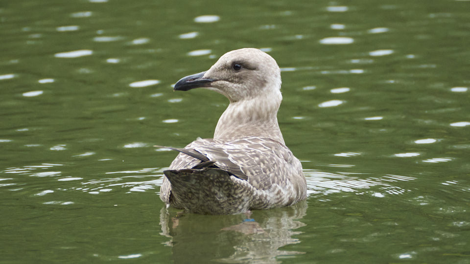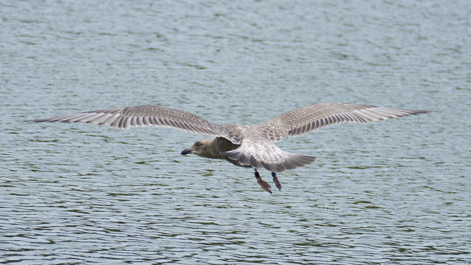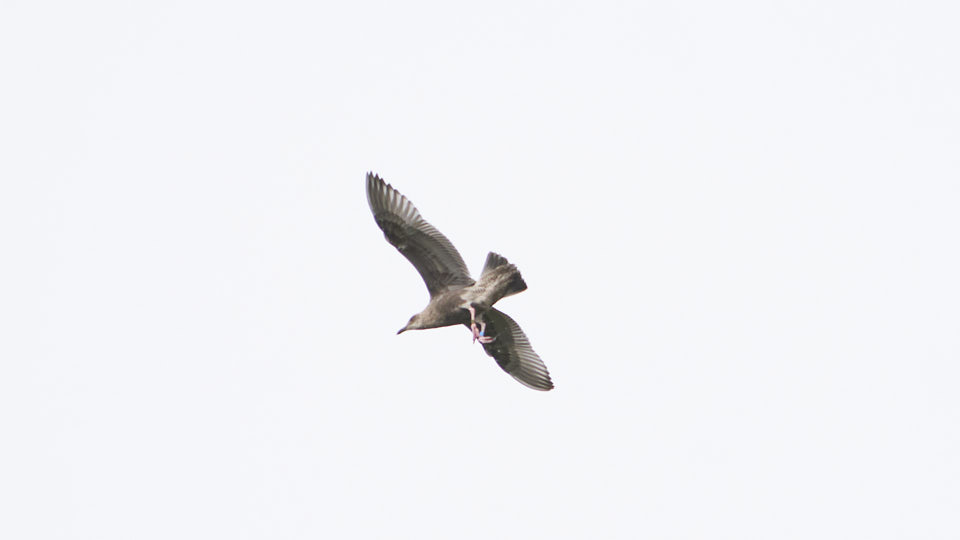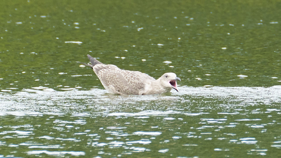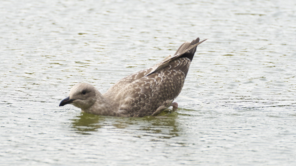 昨日、ほんの数秒見掛けたオオセグロカモメの幼鳥が、今朝も菖蒲池に現れました。
