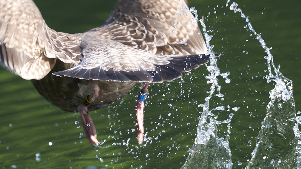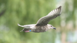 飛び去る後ろ姿を撮りました。右足環が青です。