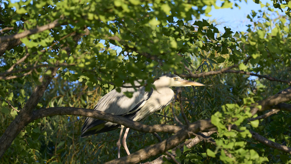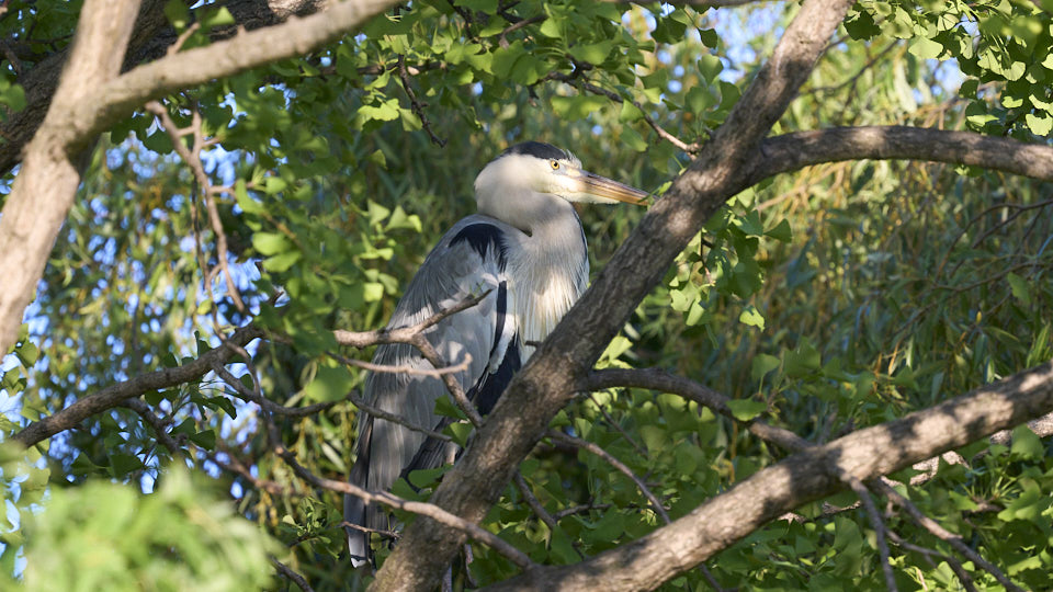 アオサギは、菖蒲池の島の木の枝に止まっていました。