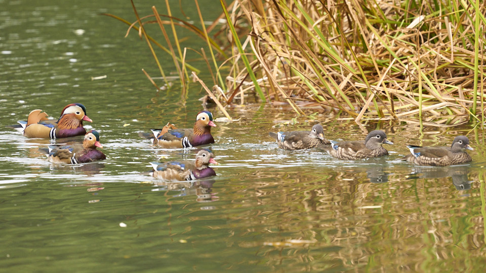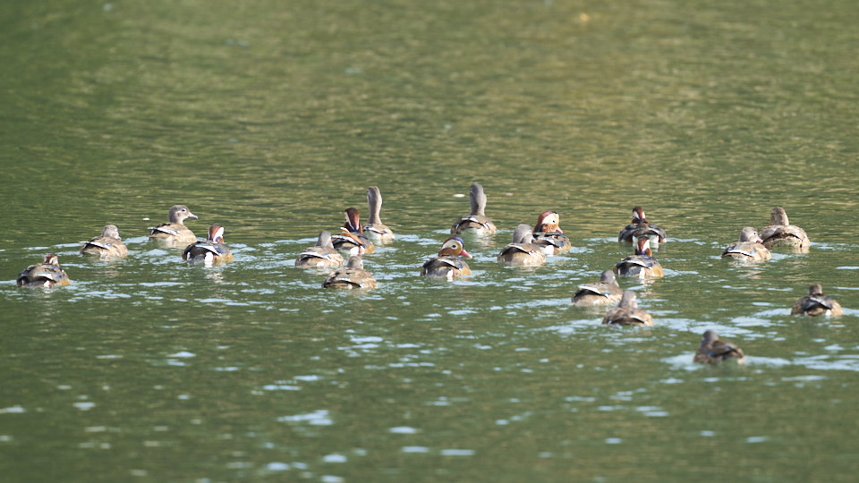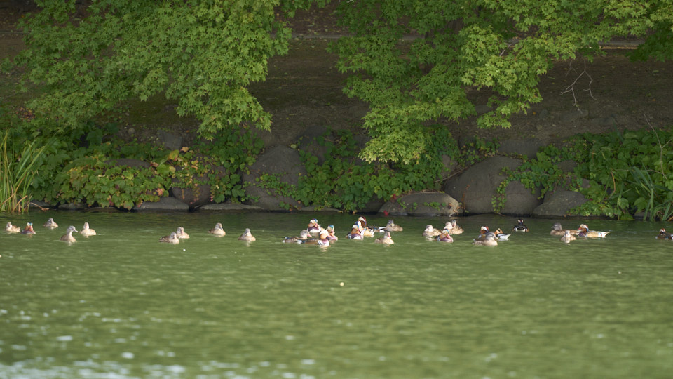 13:51の写真に写っているのは30羽ですが、写真に入りきらないオシドリもいたので、集団の総数は30羽以上でした。しばらくすると、集団はバラけました。集まって菖蒲池から飛び立つのかなと思って撮影しましたが、結局散り散りになったので、なぜ集まっていたのか不明です。