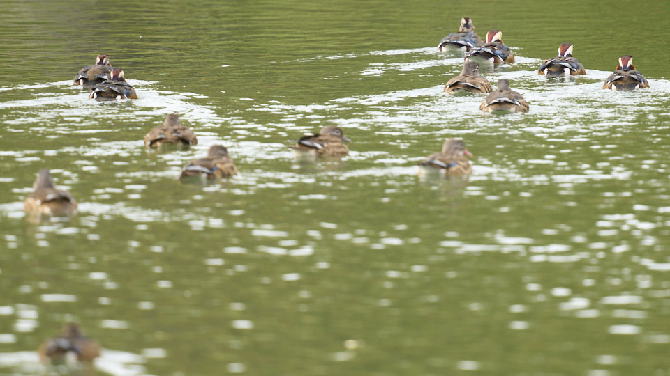 午後、オシドリが30羽以上集まって菖蒲池内を泳いでいる場面に遭遇しました。10羽程度の集団で移動するのはよく見掛けますが、ここまで多いのは初めて見ました。