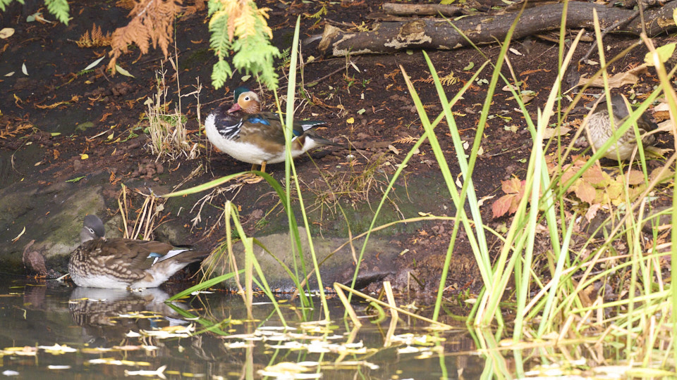 この木陰にオシドリがオス1羽を含め5羽いました。目撃情報では、菖蒲池に10羽近く残っている様です。