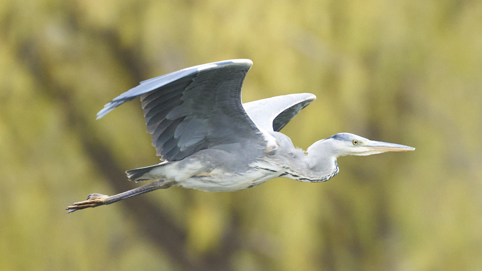 菖蒲池の上空を飛ぶアオサギ