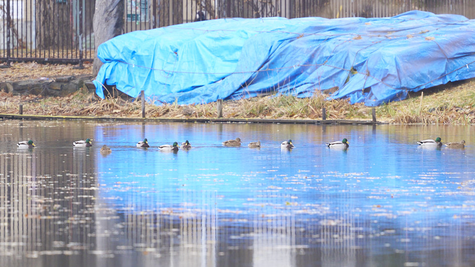 9:58 マガモと一緒に菖蒲池を泳ぎ始めました。