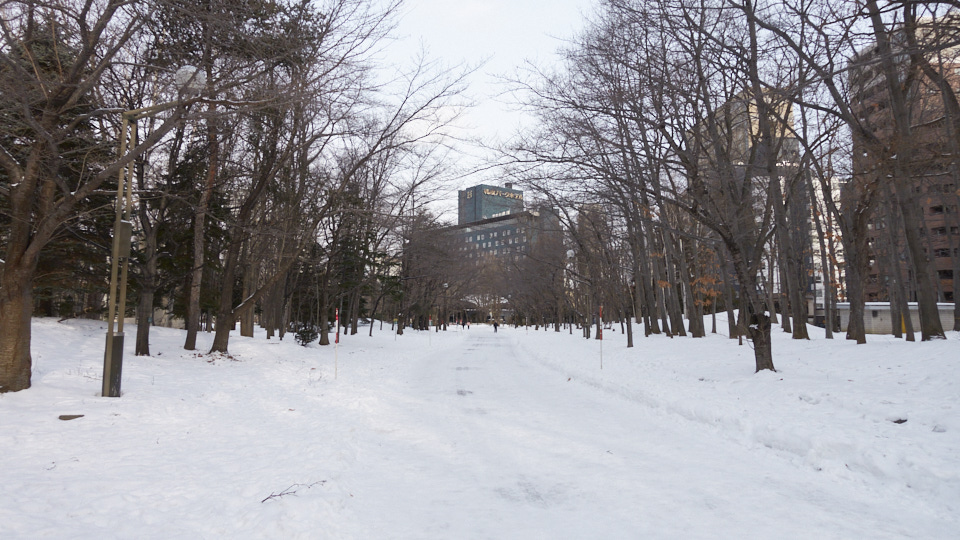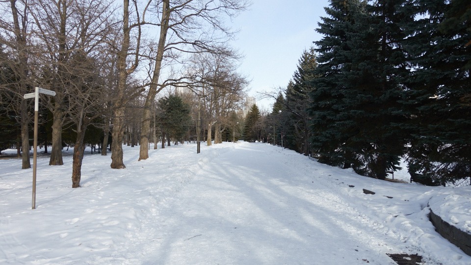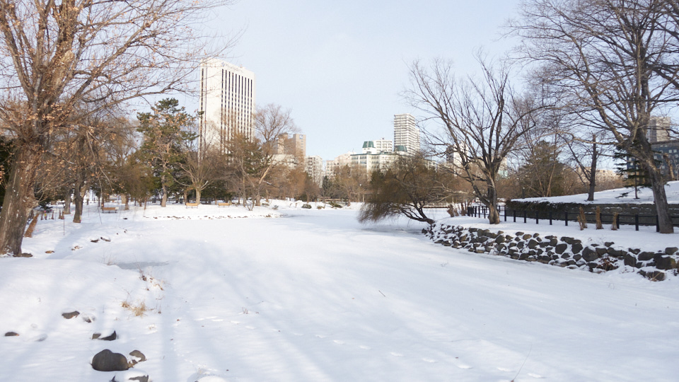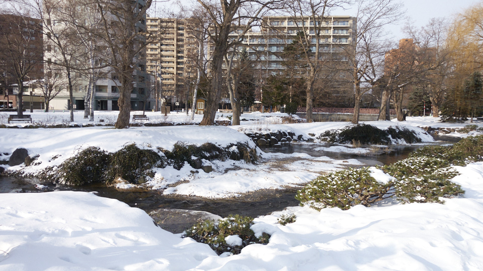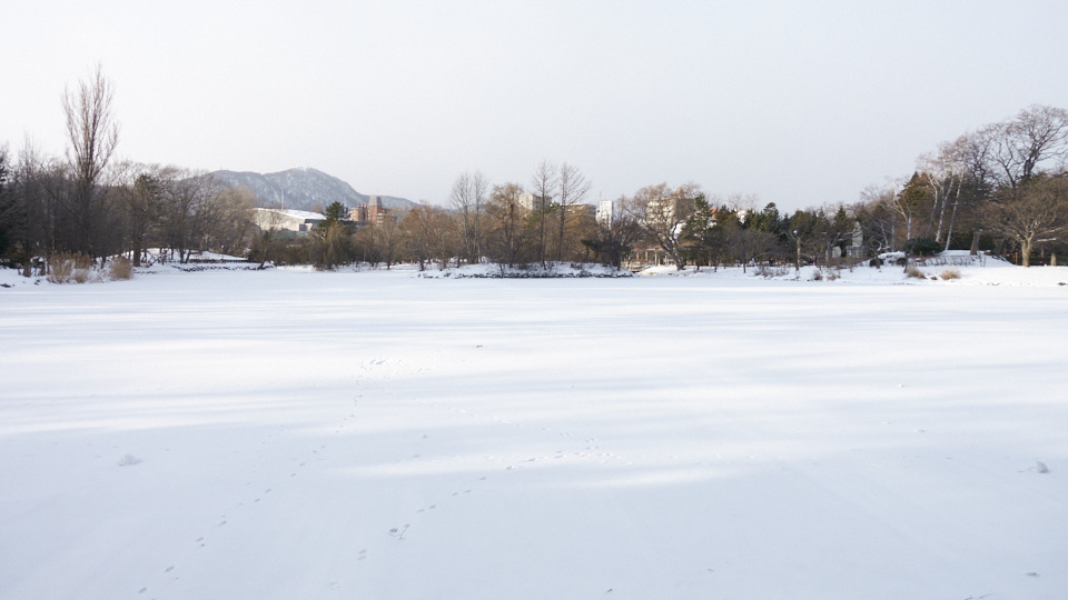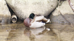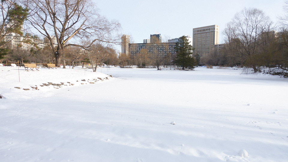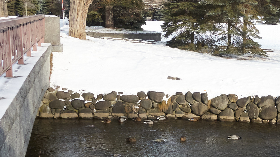 全面凍結した菖蒲池にマガモはいませんでしたが、白鶴橋付近で9羽見掛けました。