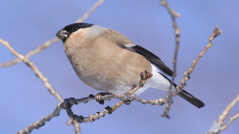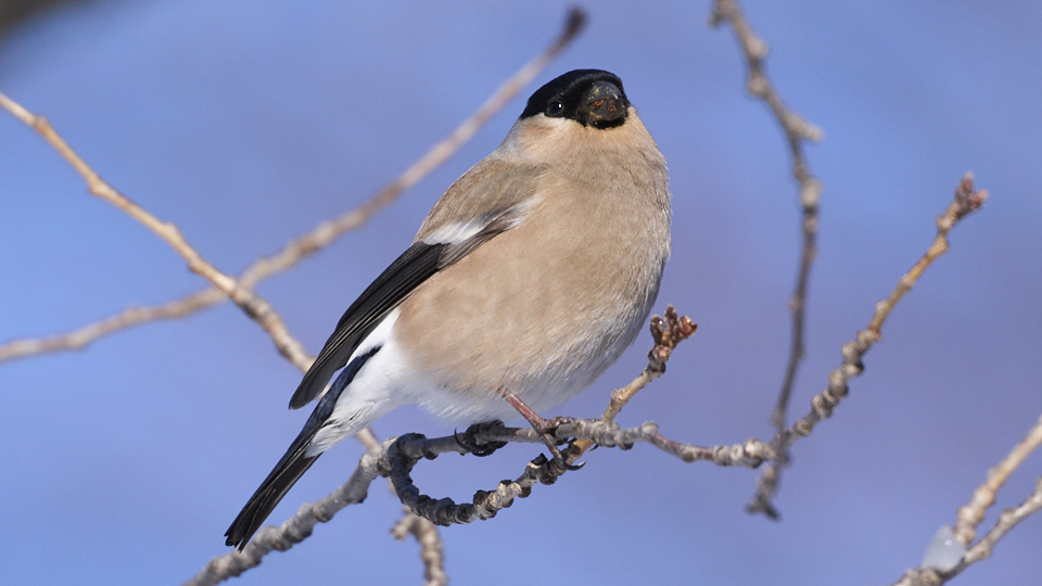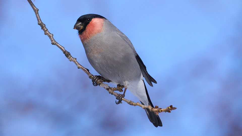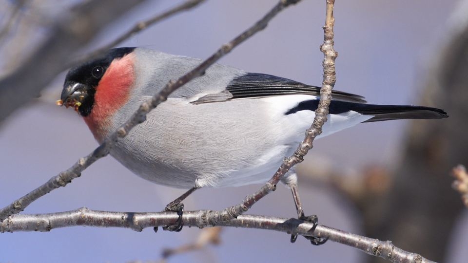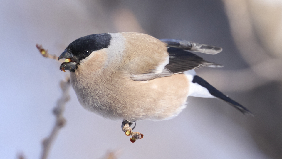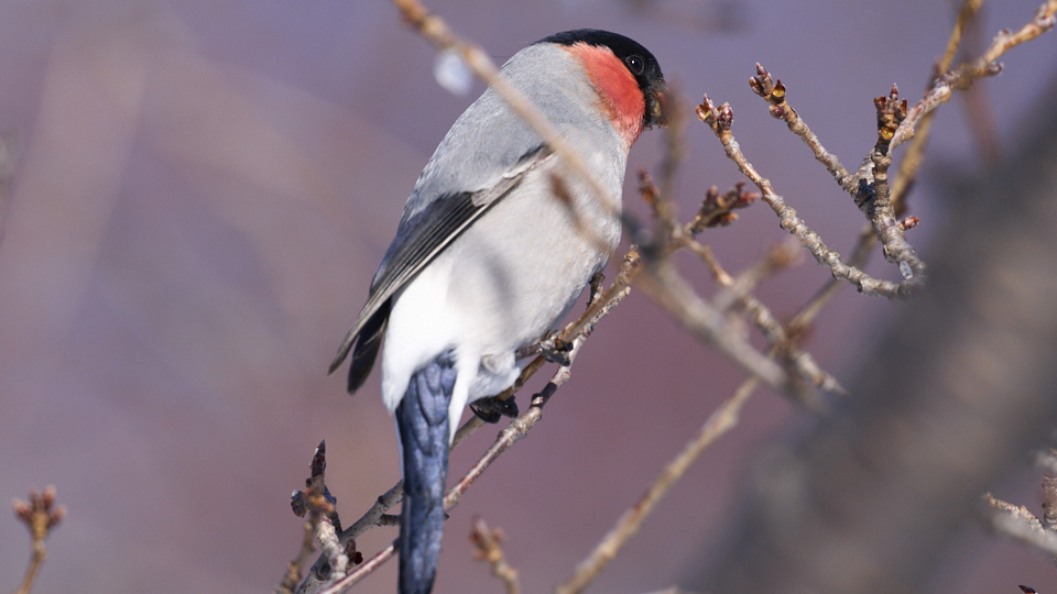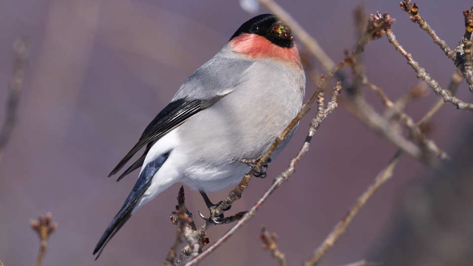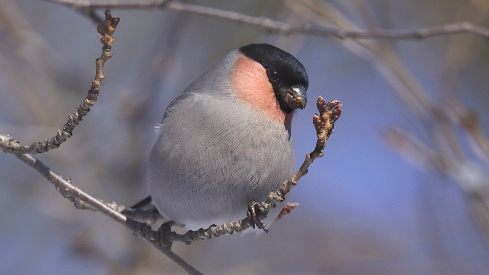 オス2羽とメス1羽が現れ、20分(9:04〜9:24)ほど桜の花芽を食べて飛び去って行きました。