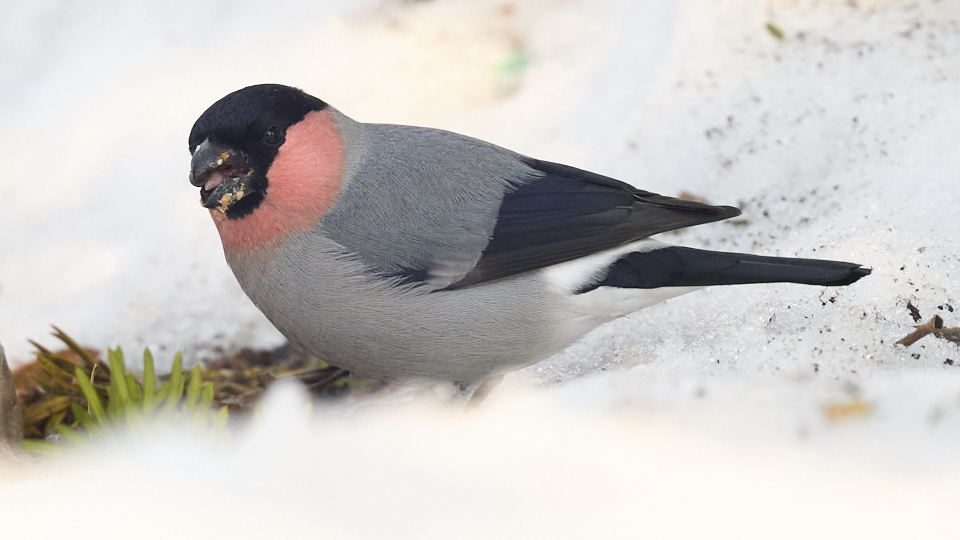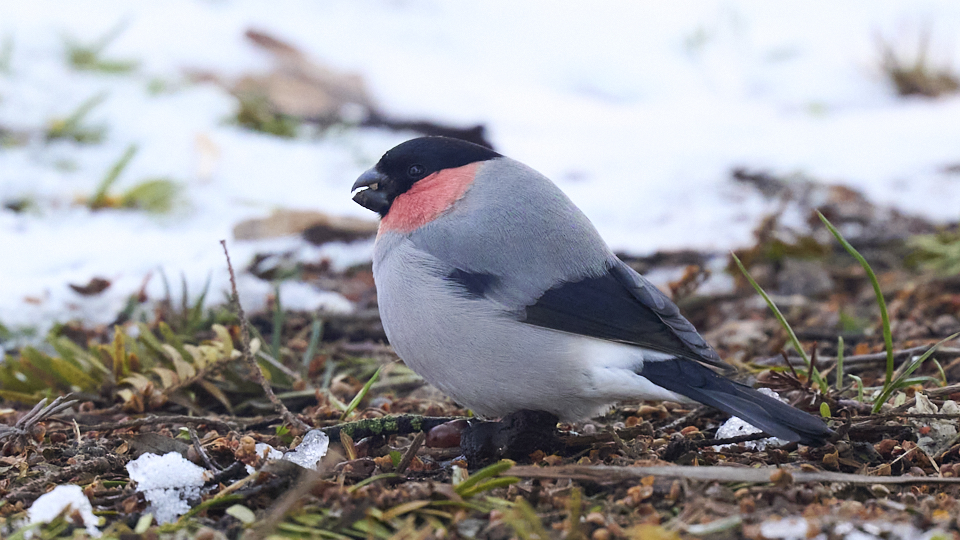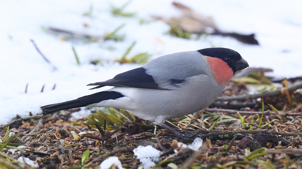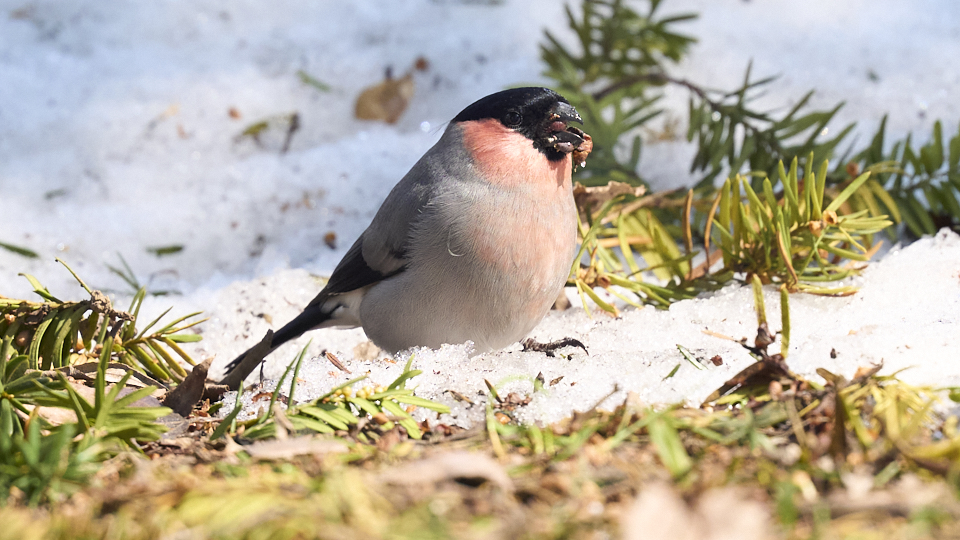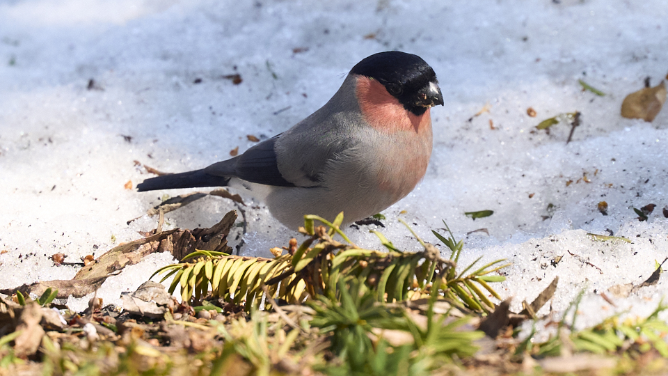 ウソを撮影できました(今年21回目)。前回(3/20)と同じ針葉樹にいて、たまに地面に降りて木の実を啄んでいました。オス2、3羽でメスも1羽いましたが、メスは撮れませんでした。