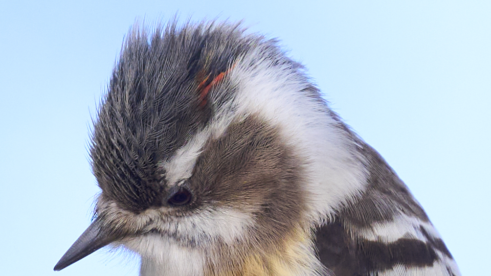 コゲラの性別の見分け方をインターネットで調べると、「オスは頭に赤い羽があるが、風が吹いて毛が煽られないと見えない」と出て来ます。