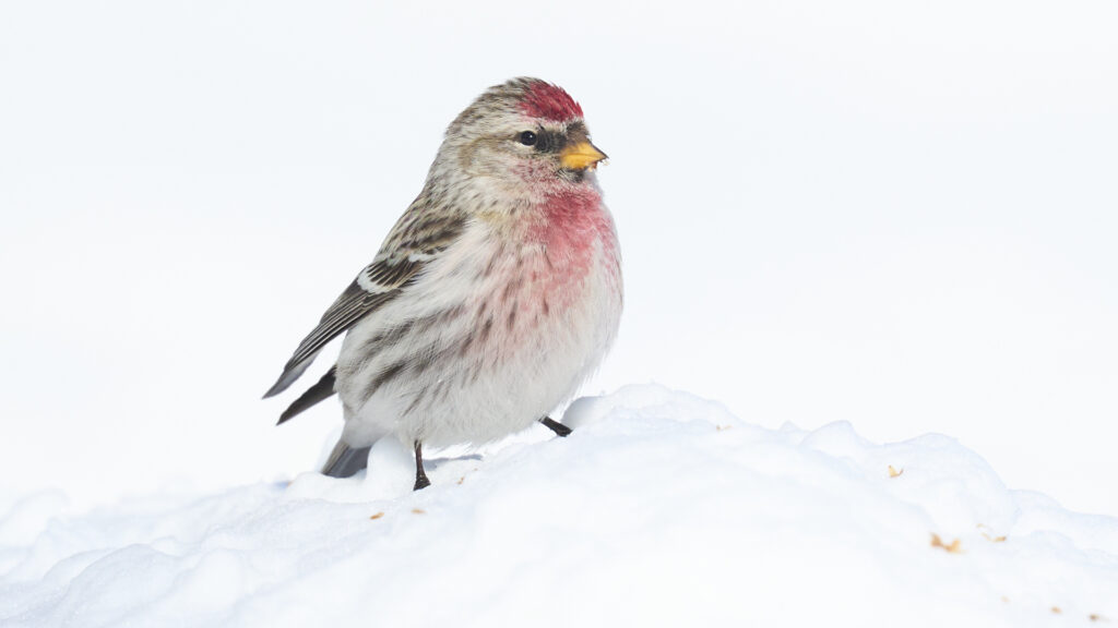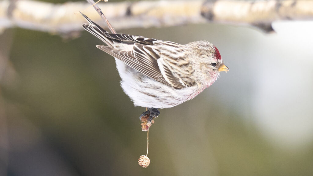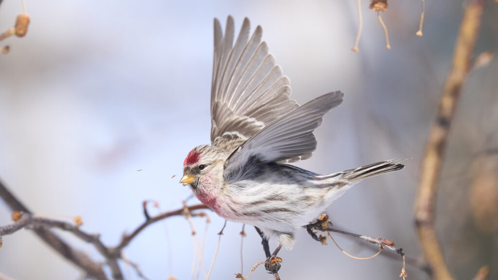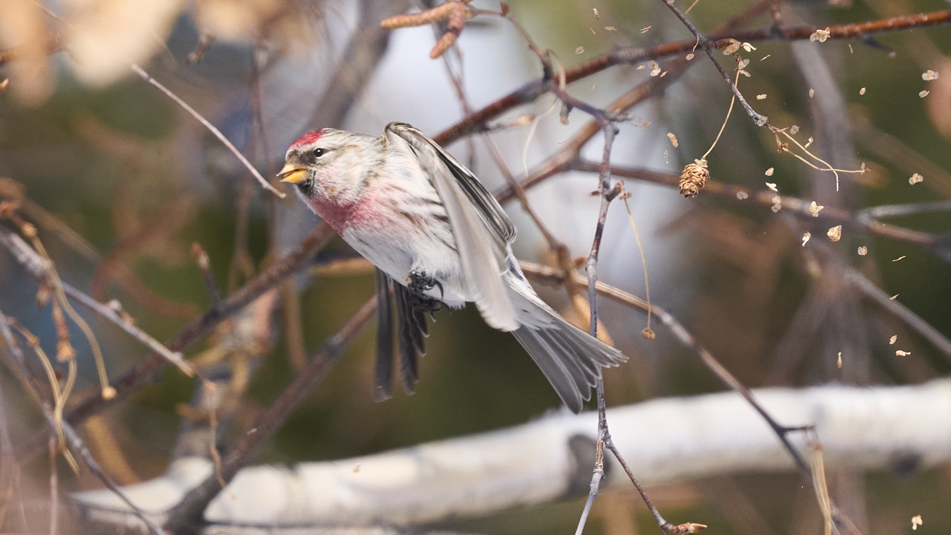人生初のベニヒワ撮影は同じく中島公園で、2025年11月24日でした。10羽以上の集団でしたが、曇り空で写りはイマイチでした。