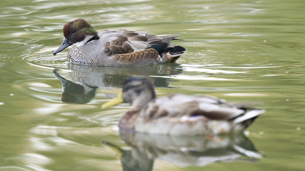 10月10日、再びヨシガモ(オス)のエクリプスが、菖蒲池に現れました。今回はオスの特徴が現れて来ています。